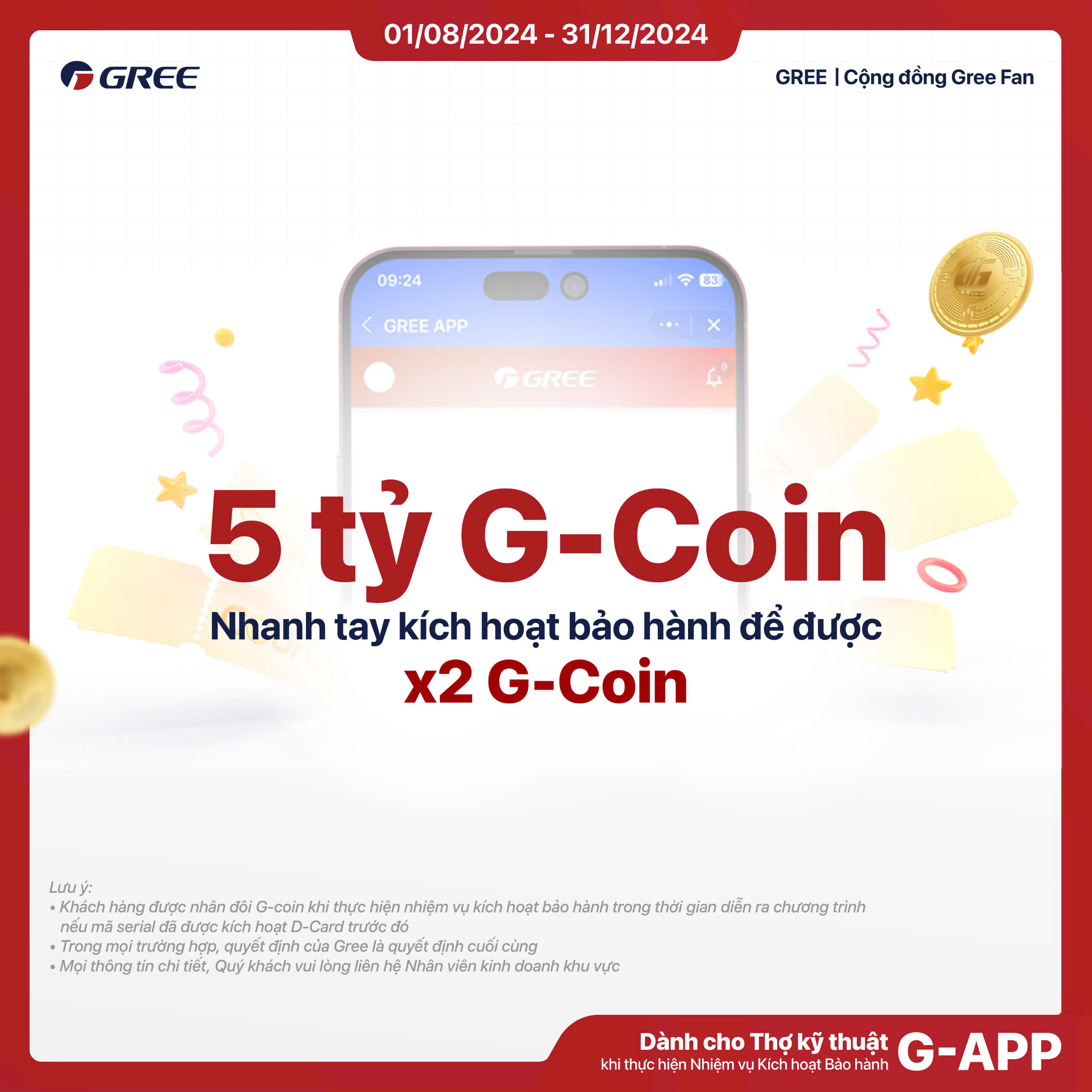 Từ ngày 1/8/2024 – 31/12/2024, Gree mở chương trình x2 G-Coin dành cho Nhiệm vụ Kích hoạt bảo hành khi kích hoạt các sản phẩm có mã serial đã được kích hoạt D-Card.