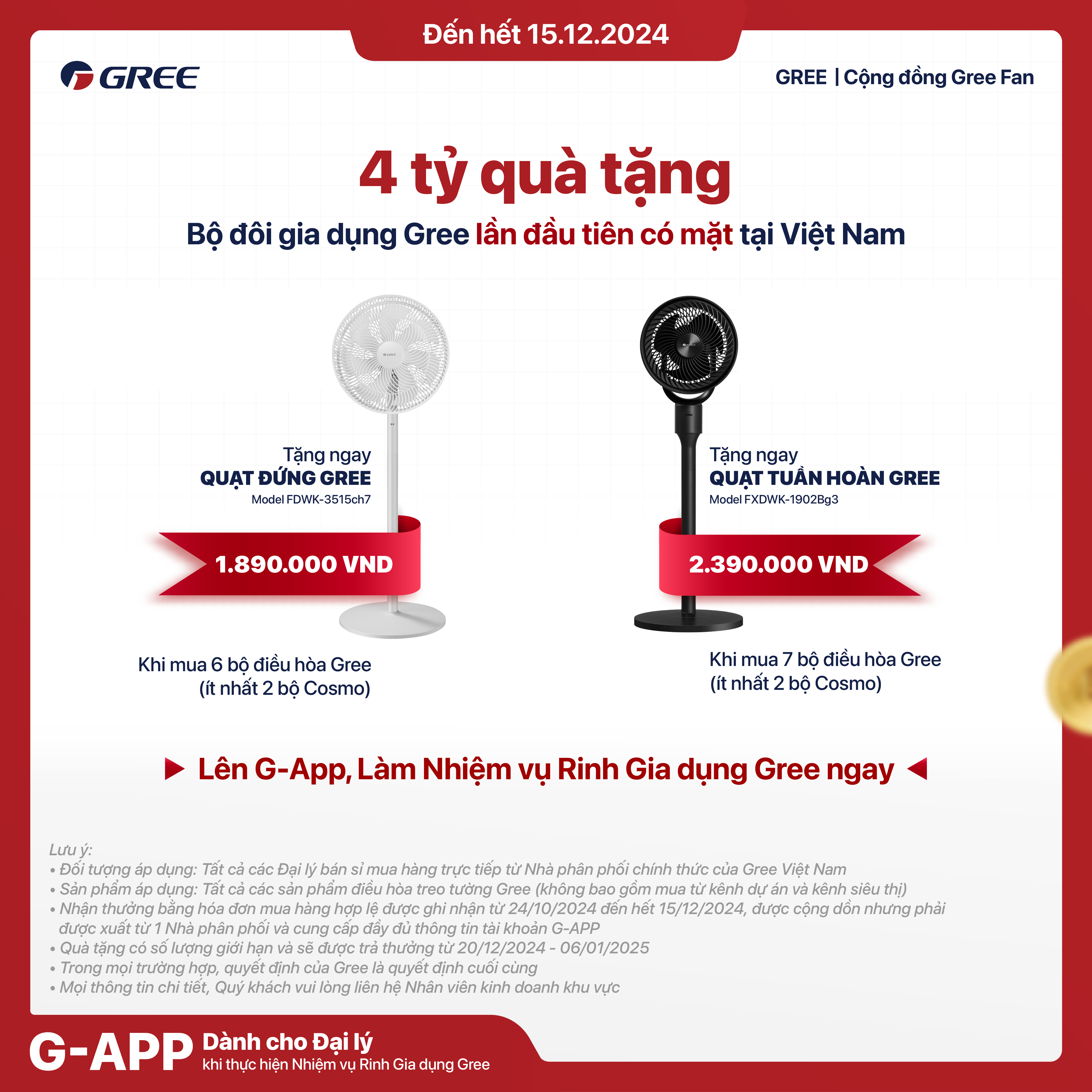 Đến hết ngày 15/12/2024, thông qua những Nhà phân phối chính thức của Gree, khi khách hàng tham gia mua các gói sau sẽ được tặng Gia dụng Gree lần đầu tiên ra mắt tại Việt Nam. Cụ thể: